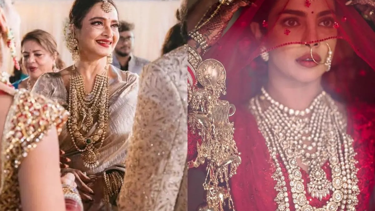 అయితే అన్నింటిలోకి బాలీవుడ్ సీనియర్ హీరోయిన్ రేఖ ఆమె వేసుకొచ్చిన నెక్లెస్ టాక్ ఆఫ్ ది ఇండస్ట్రీగా మారింది. 70 ఏళ్ల వయసులోనూ చెక్కుచెదరని గ్లామర్తో మెరిసిపోతున్నారు రేఖ. సిద్ధార్ధ్ - నీలం ఉపాధ్యాయ పెళ్లికి స్పెషల్గా డిజైన్ చేసిన ఐవరీ శారీని ధరించిన ఆమె.. దానికి మ్యాచింగ్గా జ్యువెలరీ కలెక్షన్స్ను సెట్ చేసుకున్నారు. ప్రత్యేకించి రేఖ ధరించిన నెక్లెస్ పైనే అందరి చూపు నెలకొంది. దీనికి కారణం లేకపోలేదు.. ఆమె వేసుకొచ్చిన నెక్లెస్.. ప్రియాంక చోప్రా తన పెళ్లి నాడు ధరించిన నెక్లెస్ను పోలి ఉంది. నాడు తన ట్రెడిషనల్ రెడ్ కలర్ లెహంగాపై ఈ నెక్లెస్ను ధరించారు.