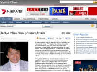 ప్రపంచ ప్రసిద్దిగాంచిన హాంగ్ కాంగ్ యాక్షన్ హీరో జాకీ ఛాన్ మరణించాడంటూ అంతటా వార్తలు వస్తున్నాయి.అయితే ఇది రూమర్ అని మరో ప్రక్క ప్రచారం జరుగుతోంది. గూగుల్ ఈ న్యూస్ కోసం విపరీతమైన సెర్చ్ జరుగుతోందని ప్రపంచ మీడియా సంస్ధలు తెలుపుతున్నాయి. 57 సంవత్సరాల వయస్సు ఉన్న జాకీ ఛాన్ లాస్ ఏంజిల్స్ లోని ఓ హాస్పటల్ లో మరణించాడంటూ వార్త వచ్చింది.స్ట్రెస్ ఎక్కువై హార్ట్ స్ట్రోక్ వచ్చిందని ఆ న్యూస్ లో ఉంది.అయితే ఇది కొందరు వ్యక్తుల కావాలనే పుట్టించని రూమర్ అని ఆయన క్షేమంగానే ఉన్నాడని,భయపడాల్సిన పనిలేదని ఆయన ఫాన్ సైట్ తెలుపుతోంది.ప్రస్తుతం జాకీఛాన్ తన తాజా చిత్రం కుంగుఫూ పాండా 2 ప్రమేషన్ వర్క్ లో బిజీగా ఉన్నారు. అలాగే ఆయన వందవ చిత్రం 1911 (టైటిల్) షూటింగ్ లో ఆయన పాల్గొంటున్నారు.ఏప్రియల్ ఒకటవ తేదీ మరో రెండు రోజుల్లో వస్తూండగా కావాలనే జనాల్ని ముందుగా ఏప్రియల్ ఫూల్ చేయటానకి ఇది కల్పించిన రూమర్ అని అంటున్నారు. ఇక ఇదంతా రూమర్ కావాలని, ఆయన క్షేమంగా ఉండాలని ధట్స్ తెలుగు కోరుకుంటోంది.