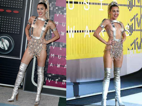 ఎంటీవీ వీడియో మ్యూజిక్ అవార్డ్స్ 2015 రెడ్ కార్పెట్ కార్యక్రమంలో మిలీ సైరస్ ఇలా నగ్నత్వాన్ని తలపించేలా విచిత్రమైన డ్రెస్ ధరించింది.