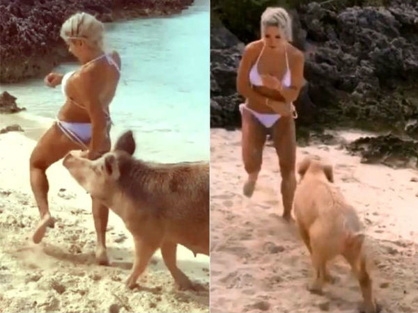 వెనిజులాకు చెందిన ఫిట్నెస్ మోడల్ మిచెల్లె లెవిన్కు బహమాస్ పర్యటనలో ఊహించని అనుభవం ఎదురైంది. బికినీలో అందాలు ఆరబోస్తున్న ఆమెను చూసి అక్కడ స్వైర విహారం చేస్తున్న పందులు కూడా టెమ్ట్ అయ్యాయి. సెక్సీగా ఉన్న ఆమె పిరుదులు వాటిలో ఎలాంటి భావనలు రేపాయో ఏమో.. కొరుక్కుతినాలని చూశాయి.