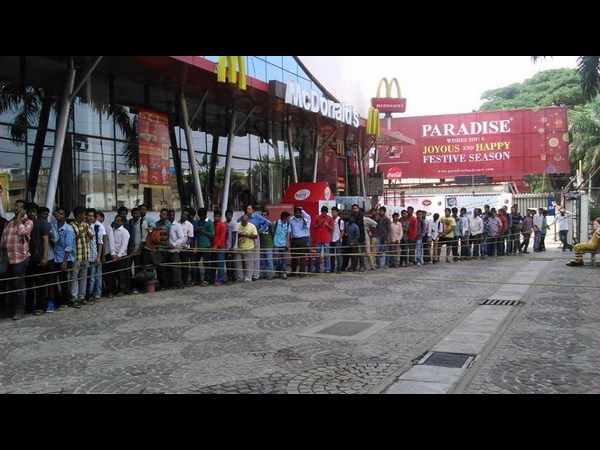ఐమాక్స్ థియేటర్ వద్ద టిక్కెట్ల కోసం బారులు తీరిన మహేష్ బాబు అభిమానులు.