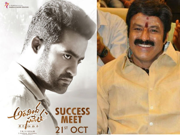 అరవింద సమేత చిత్రం బాబాయ్, అబ్బాయిలను మరోసారి కలపడానికి రంగం సిద్ధమైంది. ఆదివారం అరవింద సమేత చిత్రం సక్సెస్ మీట్ను హైదరాబాద్లోని శిల్పకళా వేదికలో నిర్వహించనున్నారు. ఈ వేడుకకు నందమూరి బాలకృష్ణ ముఖ్య అతిథిగా హాజరుకానున్నారు. చాలా ఏళ్ల తర్వాత బాలయ్య, యూనియర్ ఎన్టీఆర్ ఒకే వేదికపై కనిపించడం విశేషంగా మారింది. బాబాయ్, అబ్బాయ్ కలువబోతున్నారనే వార్త అభిమానుల్లో సంతోషాన్ని నింపింది. అక్టోబర్ 11న రిలీజైన అరవింద సమేత భారీ విజయం వైపు దూసుకెళ్తున్న సంగతి తెలిసిందే.