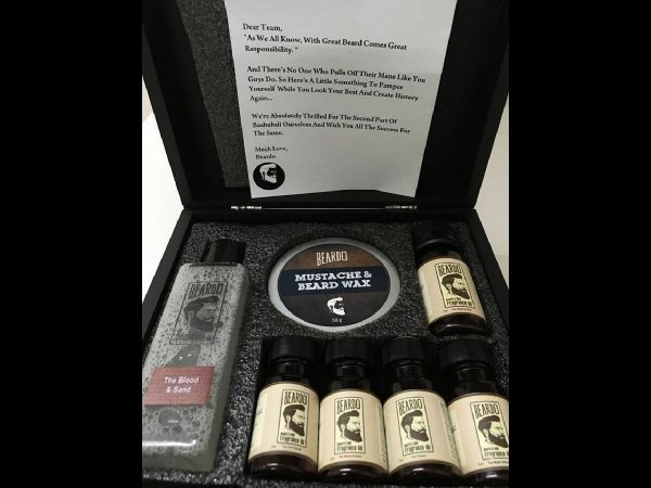 బాహుబలి సినిమాలో హీరో ప్రభాస్ తో పాటు, విలన్ రానా.....కట్టప్ప పాత్రధారి సత్యరాజ్ లతో పాటు సినిమాలో కనిపించే చాలా మంది భారీ, మీసాలతో కనిపిస్తారు. బాహుబలి షూటింగ్ సమయంలో దర్శకుడు రాజమౌళి కూడా భారీ గడ్డంతో కనిపించారు. సెకండ్ పార్టులో యాక్టర్స్ గడ్డాలు, మీసాలు మరింత అందంగా కనిపించాలని, బాహుబలి టీం సెకండ్ పార్టుతో మరో సక్సెస్ కొట్టాలని ఆకాంక్షిస్తూ.... బియర్డో కంపెనీ నుండి గిఫ్టు అందింది. సదరు గిఫ్ట్ కిట్ ఫోటోను బాహుబలి టీం సోషల్ మీడియా ద్వారా రిలీజ్ చేసింది.