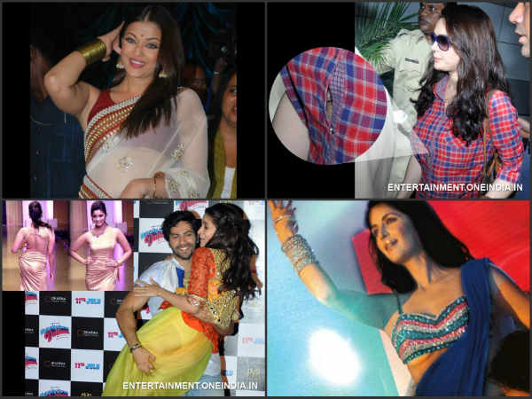 హీరోయిన్ కత్రినా కైఫ్ ఏక్ థా టైగర్ చిత్రంలో వేసుకున్న పొట్టి స్కర్టు కాస్తా ఆమె లో దుస్తులు బయటకు కనిపించేలా చేసింది. సైకిల్ ఎక్కడానికి ఇబ్బంది పడుతూ తన అందాలు ఇలా సమర్పించేసుకుంది ప్రేక్షకులకు. బాలీవుడ్లో అందాల తార ఎవరంటే టాప్లో వినిపించే పేరు ఐశ్వర్య రాయ్. రావణ్ చిత్రం ప్రమోషన్లో పాల్గొన్న ఐశ్వర్య అప్పట్లో ఓ సారి సెక్సీ చీరకట్టుతో దర్శనం ఇచ్చింది. అయితే టైలర్ ఆమె జాకెట్ మరీ చిన్నగా కుట్టడంతో ఆమె ఎద అందాలను పూర్తిగా దాచుకోవడానికి వీలు కాలేదు. దీంతో ఆమె ఎద అందాలు ఫోటోలో బంధీ అయ్యాయి.