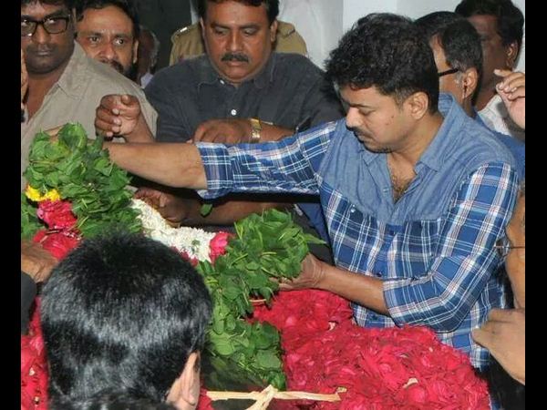కె బాలచందర్ పార్థివ దేహానికి నివాళులు అర్పిస్తున్న హీరో విజయ్.