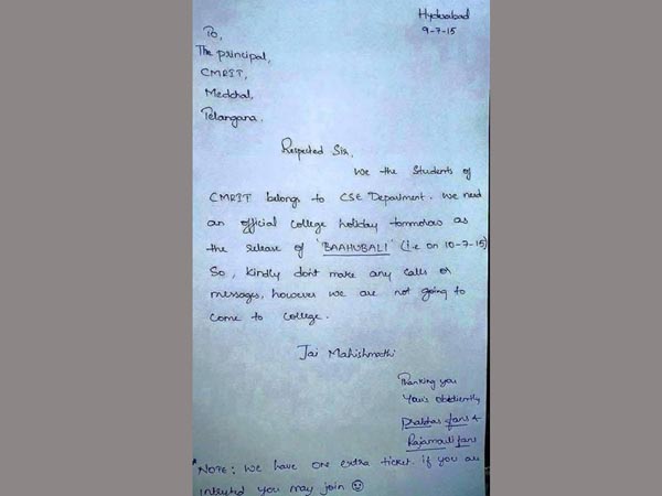 హైదరాబాద్: బాహుబలి సినిమా కోసం లీవ్ లెటర్స్ అంటూ సోషల్ మీడియాలో ఫన్నీ లీవ్ లెటర్లు దర్శనమిస్తున్నాయి. ఇక్కడ ఫోటలో కనిపిస్తున్న లీవ్ లెటర్ ఫేస్ బుక్ లో హడావుడి చేస్తోంది. ఫోటో కింద ఉన్న లెటర్ వాట్సాఫ్ లో హల్ చల్ చేస్తోంది. అవేమిటో మేం చెప్పడం కన్నా మీరు చదివితేనే మరింత ఫన్నీగా ఉంటుంది.