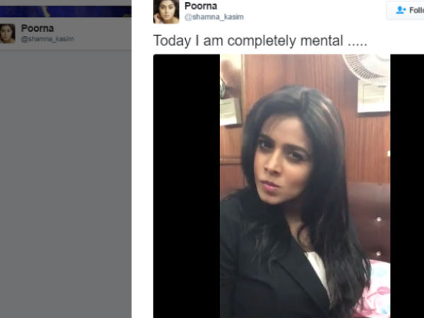 అయితే చాలా మంది సెలెబ్రిటీలు ఇటీవలి కాలంలో సెల్ఫీ వీడియోలు తీసి.. సోషల్ సైట్లలో పోస్ట్ చేస్తున్నారు. ఇప్పుడు ఆ జాబితాలోకి హీరోయిన్ పూర్ణ కూడా చేరింది. పూర్ణ మాత్రం కొంచెం వెరైటీగా తన సెల్ఫీ వీడియోను పోస్ట్ చేసింది. ''ఈ రోజంతా నేను పిచ్చిదాన్నే'' అంటూ ట్వీట్ చేసి తాను డాన్స్ చేస్తున్న వీడియోను ట్విట్టర్లో పెట్టేసింది.