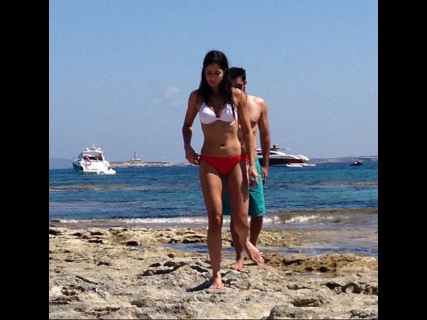 టూ పీస్ రెడ్ అండ్ వైట్ బికినీలో కత్రినా కైఫ్ స్పెయిన్ సముద్ర తీరంలో...పక్కనే ఆమె ప్రియుడు రణబీర్ కపూర్. వీరి మధ్య ప్రేమ వ్యవహారం మహా రంజుగా నడుస్తుంనడానికి ఈ ఫోటోలే నిదర్శనం అని బాలవుడ్ జనాలు గుసగుసలాడుకుంటున్నారు.
