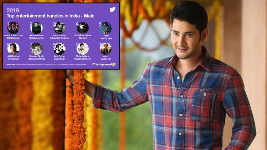 #ThisHappened2019 హాష్ ట్యాగ్తో ట్విట్టర్ వదిలిన ఈ టాప్ 10 ఎంటర్టైన్మెంట్స్ హ్యాండిల్స్ మేల్ లిస్టులో మొదటి స్థానంలో అమితాబ్ బచ్చన్ నిలిచారు. రెండో స్థానంలో అక్షయ్ కుమార్, మూడో స్థానంలో సల్మాన్ ఖాన్.. ఆ తర్వాత వరుసగా షారుక్ ఖాన్, తమిళ యాక్టర్ విజయ్, మ్యూజిక్ డైరెక్టర్ ఏఆర్ రెహమాన్ ఉన్నారు. మహేష్ బాబు 9వ స్థానంలో నిలిచారు. టాలీవుడ్ నుంచి మహేష్ ఒక్కడే నిలవడం విశేషం.