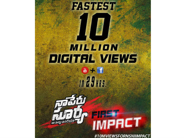 స్టైలిష్ స్టార్ అల్లు అర్జున్ హీరోగా వక్కతం వంశీ దర్శకత్వంలో తెరకెక్కుతున్న చిత్రం 'నా పేరు సూర్య నా ఇల్లు ఇండియా'. న్యూఇయర్ సందర్భంగా ఈ చిత్రానికి సంబంధించిన ఫస్ట్ ఇంపాక్ట్ టీజర్ విడుదల చేశారు. ఈ టీజర్ ఇపుడు ఇంటర్నెట్లో సంచలనం అయింది. విడుదలైన 29 గంటల్లోనే 10 మిలియన్(కోటి) డిజిటల్ వ్యూస్ సొంతం చేసుకుని ఫాస్టెస్ట్ 10 మిలియన్ మార్కు అందుకున్న టీజర్గా టాలీవుడ్లోని రికార్డులన్నీ బద్దలు కొట్టేసింది.