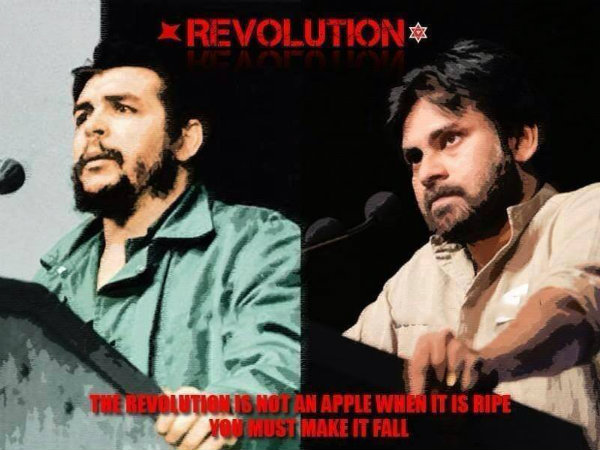 హైదరాబాద్: అంతర్జాతీయ స్థాయిలో యువతకు స్ఫూర్తినిచ్చే చేగువేరా ఫొటోలను తన సినిమాల్లోనే కాకుండా, తన కొత్త పార్టీ ఆవిర్భావ మీటింగులలో పవన్ కళ్యాణ్ ప్రదర్శించారు. ఇప్పుడు సోషల్ నెట్ వర్కింగ్ సైట్స్ లో పవన్ కళ్యాణ్ ఆహార్యం ను,మాట్లాడే విధానాన్ని ఛేగువేరా తో పోలుస్తూ, ప్రస్తావిస్తూ ఫోటోలు పెడుతున్నారు. ఇండియన్ ఛేగువేరా అన్నట్లు పవన్ ని అభిమానులు ప్రొజెక్టు చేస్తున్నారు. ఇప్పుడు మీరు చూస్తున్న ఫోటో ...ఫేస్ బుక్ ,ట్విట్టర్ లలో విపరీతంగా సర్కులేట్ అవుతూ అభిమానులను అలరిస్తోంది. ఈ విధంగా ఛేగువేరా వంటి మహా నాయుకుడుని చాలా మంది ఇప్పటికే తెలుసుకోనివారు తెలుసుకోవటానకి ప్రయత్నించటం జరుగుతోంది. అయితే మరోప్రక్క ఈ ఫోటోపై విమర్శలు కురుస్తున్నాయి.