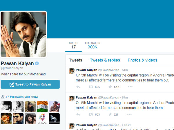 ఈ మధ్య కాలంలో పవన్ కళ్యాణ్ తన రాజకీయ పరమైన అభిప్రాయాలను, అంశాలను, తన పర్యటనల ట్విట్టర్లో ఎప్పటికప్పుడు వెల్లడిస్తున్నారు. దీంతో ఆయన్ను ఫాలో అయ్యే వారి లిస్టులో అభిమానులతో పాటు పలు రాజకీయ నాయకులు కూడా చేరి పోయారు. దీంతో ఆయన ట్విట్టర్ అకౌంట్ ఫాలో అయ్యే వారి సంఖ్య 3 లక్షల(300k)కు చేరుకుంది. ట్విట్టర్ ఖాతా ఓపెన్ చేసిన 2 నెలల్లోనే ఈ రేంజిలో పాలోయింగ్ పెరగడం చర్చనీయాంశం అయింది.