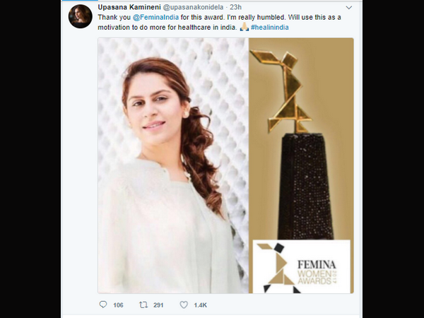 హెల్త్ కేర్ రంగంలో ఆమె చేస్తున్న సేవలకు గాను.. ఫెమినా ఉమన్స్ అవార్డ్స్ 2017లో ఈమెకు ప్రత్యేకంగా అవార్డ్ ఇచ్చారు. ఉపాసన ఈ విషయాన్ని అందరితోను పంచుకోగా.. ఉపాసన-అవార్డు ఫోటోలను కలిపి పోస్ట్ చేసిన రామ్ చరణ్.. 'నిన్ను చూస్తే గర్వంగా ఉంది ఉప్సీ' అంటూ తన అభినందనలు చెప్పాడు.