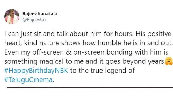 బాలయ్య బాబు బర్త్ డే సందర్భంగా టాలీవుడ్ మొత్తం విషెస్ తెలిపింది. అందులో భాగంగా రాజీవ్ కనకాల మాట్లాడుతూ.. 'ఆయన గురించి మాట్లాడేందుకు ఎన్ని గంటలైనా కూర్చొని ఇట్టే చెప్పొచ్చు. ఆయన పాజిటివ్ నేచర్, దయాగుణమే ఆయన ఏంటో చెబుతాయి. లోపల బయటా ఒకేలా ఉంటారు. ఆయనతో తెరపై తెర వెనక ఆయనతో ఉన్న అనుభవం ఎంతో అద్భుతం. ఇది ఇంకా మున్ముందు కొనసాగాలి. తెలుగు సినిమాకు నిజమైన లెజెండ్' అని చెప్పుకొచ్చాడు.