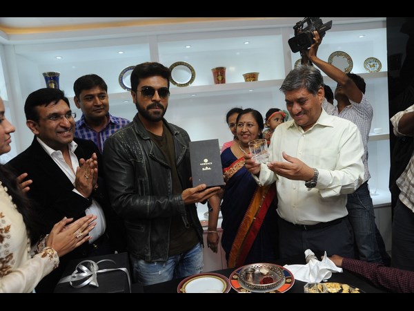 రామ్ చరణ్కు స్వాగతం పలుకుతున్న స్టోర్ నిర్వాహకులు.