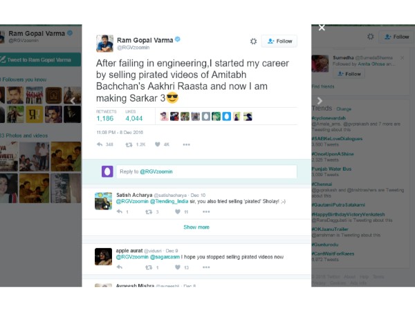 ఇంజినీరింగ్ ఫెయిల్ కావడంతో ఫైరసీ వీడియోలు అమ్మడం మొదలెట్టానని స్వయాన ఆయన ట్విట్టర్ ఖాతా ద్వారా వెల్లడించాడు రామ్గోపాల్ వర్మ