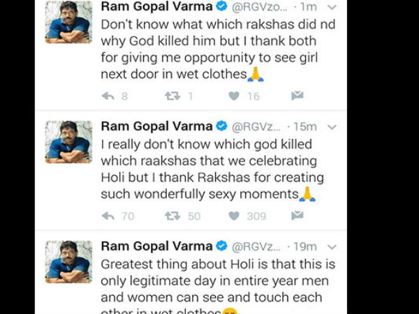 "ఈ దేశం లోఉన్న 120 కోట్ల మందికి హోళీ ఏకారణం తో చేసుకుంటామో తెలియకపోయినా హోళీ జరుపుకుంటారు, ఎందుకంటే భంగ్ తాగటానికి పెద్దకారణాలు అవసరం లేదు మేరా భారత్ మహాన్" షఅసలు ఏరాక్షసుడు ఏం చేసి ఏదేవుడితో చంపబడ్డాడో గానీ, పక్కింటి అమ్మాయిలను తడిబట్టల్లో చూసే అవకాశం ఇచ్చినందుకు వారికి నా కృతఙ్ఞతలు" అంటూ నానా రకాల ట్వీట్లు వేశాడు వర్మ. అయితే మళ్ళీ ఇంతకుముందు పడ్డ మొట్టికాయలు గుర్తొచ్చాయో మళ్ళీ ఎందుకు అనవసర రాద్దాంతం అనుకున్నాడో గానీ మళ్ళీ ఆ ట్వీట్లన్నీ తీసేసాడు కానీ అప్పటికే చూడాల్సిన వాళ్ళు చూసేసారు. ఆ స్క్రీన్ష్ట్ట్లతో కొన్ని పంచ్ లుకూడా పడిపోయాయి.