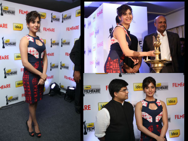 60వ తెలుగు ఫిల్మ్ ఫేర్ సౌతిండియా నామినేషన్ల వివరాలు గురువారం హైదరాబాద్లో ప్రకటించారు. ఈ కార్యక్రమానికి సమంత ముఖ్య అతిథిగా హాజరైంది. ఈ సందర్భంగా ప్రత్యేకంగా డిజైన్ చేసిన డ్రెస్ లో హాజరైన సమంత అందాల భరిణెలా మెరిసి పోయింది. ఆమె అదం చూసి మైమరిచిపోయి వారు అక్కడ లేరంటే అతిశయోక్తి కాదేమో!