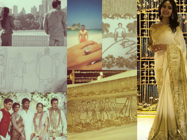 సమంత చీర ఆమె ప్రేమకథను, చైతూపై ఆమెకున్న ప్రేమను తెలుపుతోంది. సమంత చీర అంచును బాగా గమనిస్తే.. అందులో ‘ఏమాయ చేసావె' చిత్రంలోని ఓ సన్నివేశం నుంచిమొన్నమొన్న జరిగిన అఖిల్ నిశ్చితార్థంలో దిగిన ఫ్యామిలీ ఫొటో వరకు దృశ్యాలు కనిపిస్తాయి.