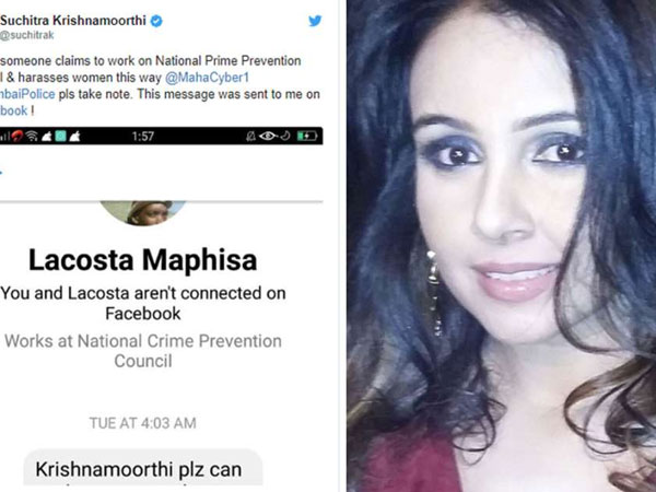 ఆ విదేశీయుడు తనకు తాను నేషనల్ క్రైమ్ ప్రివెన్షన్ కౌన్సిల్ లో ఉద్యోగస్తుడిగా ఫేస్ బుక్ ప్రొఫైల్ క్రియేట్ చేసుకున్నాడు. దీంతో అతడు పంపిన అసభ్యకర సందేశం, ప్రొఫైల్ స్క్రీన్ షాట్ తీసి ముంబయి పోలీసులకు, సోషల్ మీడియా సెల్ కి ట్యాగ్ చేస్తూ ట్వీట్ చేసింది నటి సుచిత్రా కృష్ణమూర్తి.