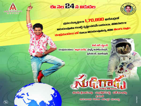 మరో పోస్టర్లో....ప్రపంచ వ్యాప్తంగా 'సుడిగాడు చిత్రం 1,79,890 థియేటర్లలో విడుదలవుతూ రికార్డు సృష్టించడమే కాకుండా, తొలిసారిగా చంద్రమండలంలో విడుదలవుతున్న తొలి తెలుగు చిత్రం అంటూ ప్రకటించారు. అంతటితో ఆగకుండా నీల్. లెగ్స్ట్రాంగ్, చంద్రమండలం అల్లరి నరేష్ ఫ్యాన్ అసోయేషన్ అంటూ నేమ్ తగిలించారు.