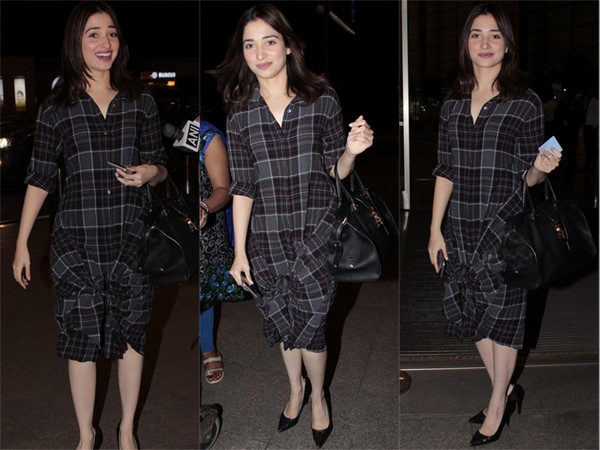 గళ్ళ లుంగీ మోకాళ్ళ దాకా ఎగ్గట్టి.... ఎయిర్ పోర్ట్ లో తమన్నా డ్రెస్