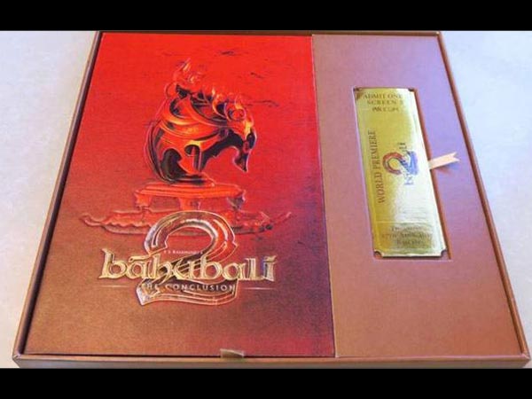 మంచి దళసరి కవర్ పేజీలతో ఇన్విటేషన్ను డిజైన్ చేశారు. వీటిపై గోల్డ్ టికెట్ అని ముద్రించారు. దానిపై వరల్డ్ ప్రీమియర్ బాహుబలి2 అని ముద్రించారు.
