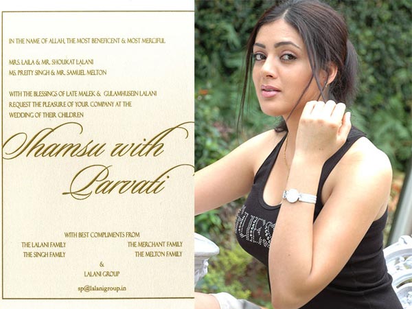 ముంబై: హీరోయిన్ పార్వతి మెల్టన్ త్వరలో తన ప్రియుడు శంషు లలానీని పెళ్లి చేసుకుంటున్న సంగతి తెలిసిందే. డిసెంబర్ 29న గ్రాండ్ గా వీరి వివాహం జరుగనుంది. ఇప్పటికే వీరి వెడ్డింగ్ కార్డ్స్ కూడా రెడీ అయ్యాయి. అందుకు సంబంధించిన ఫోటోలను ఇక్కడ వీక్షించవచ్చు. ఈ నెల 29న ముంబై నగరం వర్లీ ప్రాంతంలోని ఫోర్ సీజన్స్ అనే స్టార్ హోటల్ లో రాత్రి 8.30 గంటల నుంచి 11.30 గంటల వరకు రిసెప్షన్ ఏర్పాటు చేసారు.