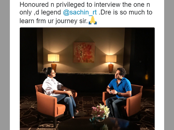‘క్రికెట్ లెజెండ్ సచిన్ను ఇంటర్వ్యూ చేయడం ఎంతో గర్వంగా ఉంది. ఆయన జీవితం నుంచి నేర్చుకోవాల్సింది ఎంతో ఉంది. ఆయన జీవితం ఎంతో మందికి స్ఫూర్తిగా నిలుస్తుంద'ని ట్వీట్ చేసింది. సెలబ్రిటీలూ కొన్ని సార్లు ఇలా అభిమానులైపోతారు. అయినా సచిన్ లాంటి ప్రపంచ ప్రసిద్ద క్రికెటర్ తో కాసేపైనా గడిపి, ఆయన్ని ప్రశ్నలడిగే చాస్ వస్తే ఎంతటి సెలబ్రిటీ అయినా ఇంత ఆనందపడటం లో అశ్చర్యం ఏముందీ.
