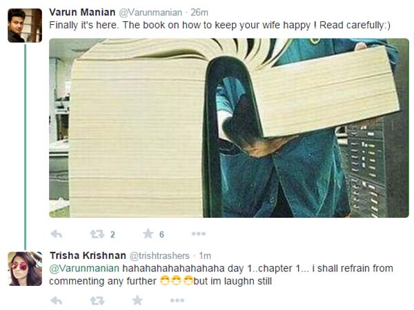 అది ప్రక్క పెడితే...ఆమెకు ఎంగేజ్ మెంట్ అయ్యిందని చెప్పబడుతున్న నిర్మాత వరుణ్ ...ఓ ట్వీట్ ఈ రోజు సాయింత్రం చేసారు. దానికి వెంటనే త్రిష రిప్లై ఇచ్చింది. ఆ ట్వీట్ ఏంటో మీరు క్రింద చూడండి. దాన్ని బట్టి నిర్ణయించుకోండి. అయితే ఎంగేజ్ మెంట్ అయితేనే ఇలాంటి ట్వీట్, క్రింద కామంట్ చేయాలా..ప్రెండ్ షిప్ కొద్దీ చేయకూడాదా అంటారా అదీ పాయింటే.