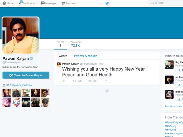 ఆయన ట్విట్టర్ ఖాతా ఓపెన్ చేసిన ఒక రోజులో 2,15,000 ఫాలోవర్స్ అయ్యారు. తాజాగా పవన్ కళ్యాణ్ పవన్ కళ్యాణ్ 2వ స్థానం దక్కించుకున్నాడు. 24 గంటల్లో పవన్ కళ్యాణ్ ఖాతాను అనుసరించే వారి సంఖ్య 91వేలకు చేరుకుంది.