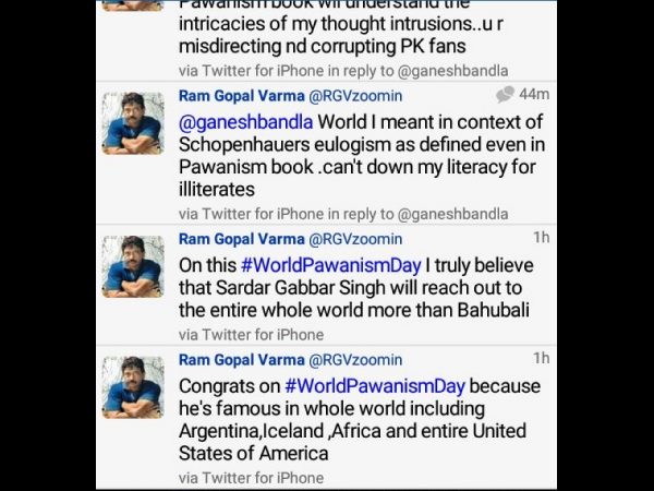 హైదరాబాద్: వివాదాస్పద దర్శకుడు రామ్ గోపాల్ వర్మ ‘వరల్డ్ పవనిజం డే' సందర్భంగా చేసిన ట్వీట్.... నిర్మాత బండ్ల గణేష్, వర్మకు మధ్య ఆసక్తికర చర్చకు దారి తీసింది. వరల్డ్ పవనిజం డే సందర్భంగా నేను ఓ విషయం బలంగా నమ్ముతున్నాను. సర్దార్ గబ్బర్ సింగ్ చిత్రం బాహుబలి కంటే పెద్ద హిట్టవుతుందంటూ వర్మ ట్వీట్ చేసారు. ఈ ట్వీటుకు నిర్మాత బండ్ల గణేష్ కామెంట్ చేయడం, వర్మ కూడా మళ్లీ రిప్లై ఇవ్వడం ఇలా పెద్ద చర్చకే దారి తీసింది.