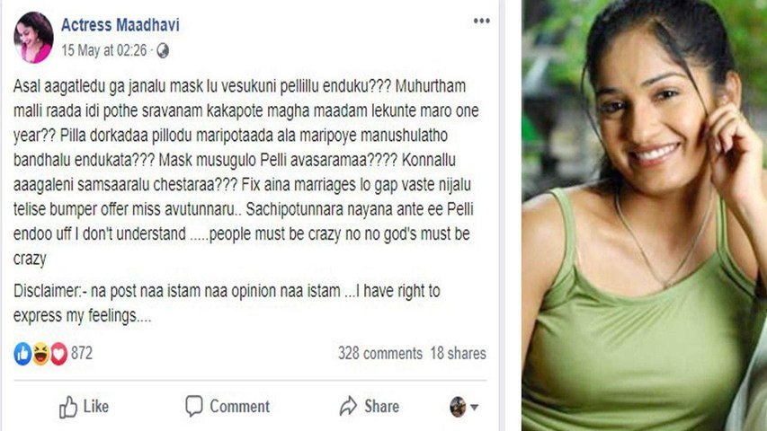 నిత్యం ఏదో ఒక వివాదాస్పద పోస్ట్ చేసే మాధవీలత లాక్ డౌన్లో జరిగి పెళ్లిళ్లపై ఫైర్ అయింది. ఈ మేరకు పోస్ట్ చేస్తూ.. ‘అసలు ఆగట్లేదుగా జనాలు.. మాస్క్లు వేసుకుని పెళ్లిళ్లు ఎందుకు?.. ముహూర్తం మళ్లీ రాదా ఇది పోతే.. శ్రావణం కాకపోతే మాఘ మాసం లేకుంటే మరో ఏడాది? పిల్ల దొరకదా? పిల్లొడు మారిపోతడ.. అలా మారిపోయే మనుషులతో బంధాలు ఎందుకటా? మాస్క్ ముసుగులో పెళ్లి అవసరమా? కొన్నాళ్లు ఆగలేని వాళ్లు సంసారాలు చేస్తారా?