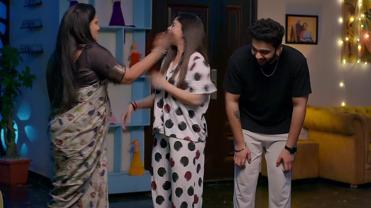 తమ గదిలో ఉన్న బెలూన్స్ ని చూసి తల్లికి బర్త్డే అనుకొని తాగిన మత్తు లో తల్లికి హ్యాపీ బర్త్డే చెప్తూ బెలూన్స్ పగలగొడతాడు రాహుల్. లాఫింగ్ గ్యాస్ రిలీజ్ అయి ఇద్దరికీ నవ్వు వస్తుంది. నవ్వుతూనే ఈరోజు నా బర్త్డే కాదు ఎవరిదో బర్త్డే అయితే మన రూమ్ లో బెలూన్స్ పెట్టారు కానీ నవ్వుతూనే మరొక బెలూన్ పేలుస్తుంది రుద్రాణి.