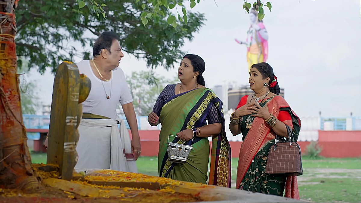 చాలా సేపు డిస్కర్షన్ జరిగిన తర్వాత తన దగ్గర ఉన్న సగం డబ్బులను బాలు.. ఫైనాన్సియర్కు ఇస్తాడు. దీంతో మిగిలిన డబ్బులు కూడా త్వరగా ఇవ్వాలని వార్నింగ్ ఇస్తాడు. ఇక, వాళ్లు మాట్లాడుకుంటున్నది చూసిన ప్రభావతి, కామాక్షి ఇంటి తాకట్టు గురించే మాట్లాడుతున్నారని భయపడిపోతారు. అప్పుడు కామాక్షి 'అసలు ఈ ఇంటి గురించి నాకు ఏమీ తెలీదు. నన్ను ఇంక ఇందులో ఇన్వాల్వ్ చేయకు వదిన. ఆ బాలు గాడు వెళ్లి మా ఆయనకు చెప్పాడంటే నా పని అయిపోతుంది' అని ప్లేట్ ఫిరాయిస్తుంది. తర్వాత అంతా వెళ్లి గుడిలో దండం పెట్టుకుంటారు.