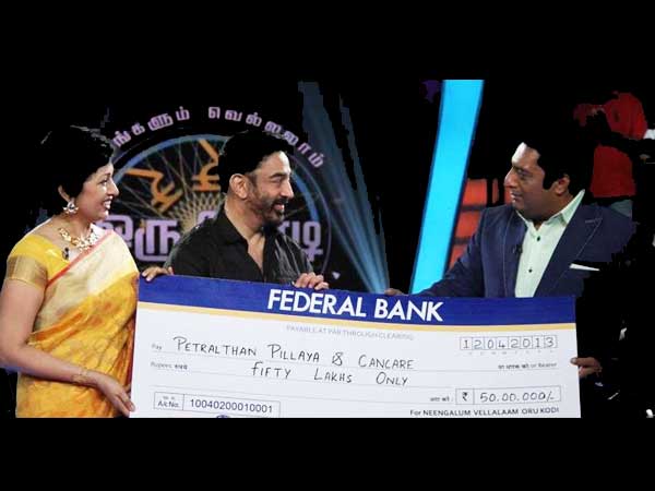 వివరాల్లోకి వెళితే... విలక్షణ నటుడు ప్రకాష్ రాజ్ వ్యాఖ్యాతగా 'నీంగలుం వెల్లలామ్ ఒరికోడి' పేరిట ఓ ప్రైవేటు ఛానెల్లో కార్యక్రమం ప్రసారం అవుతోంది. ఈ కార్యక్రమంలో అన్ని ప్రశ్నలకు సరైన జవాబులు చెప్పిన వారు రూ.కోటి గెల్చుకునే అవకాశం ఉండటం ఇందులోని ప్రధానాంశం. నటి గౌతమితో కలిసి కమల్హాసన్ ఇటీవల ఈ షోలో పాల్గొన్నారు. వారు పలు ప్రశ్నలకు జవాబులు చెప్పి రూ.50 లక్షలు గెలుచుకున్నారు. తర్వాత ఆ మొత్తాన్ని క్యాన్సర్ బాధితుల సంక్షమానికి కృషి చేస్తున్న 'పెట్రాల్దాన్ పిల్లయా' స్వచ్ఛంద సంస్థకు ఇవ్వాలని ప్రకాష్రాజ్కు తిరిగి అందజేశారు.