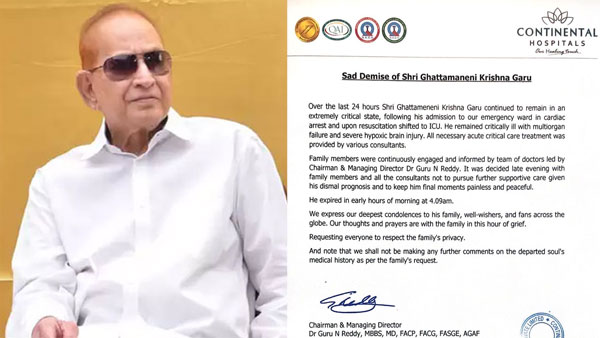 కృష్ణ గారి మరణంతో తీవ్ర విషాదంలో మునిగిపోయిన కుటుంబ సభ్యులకు, శ్రేయోభిలాషులకు, అభిమానులకు మా ప్రగాఢ సంతాపం తెలియజేస్తున్నాం. ఈ విషాదం వేళ మనోధైర్యం కూడగట్టుకోవాలని, వారికి మా సపోర్ట్ ఎల్లవేళలా ఉంటుందని తెలియజేస్తున్నాం. వారి కుటుంబానికి తగినంత ప్రైవసీ ఇవ్వాలని ప్రతీ ఒక్కరికి మనవి చేస్తున్నాం. కుటుంబ సభ్యుల కోరిక మేరకు ఆయన మరణం గురించి వివరాలు, సమాచారాన్ని మేము వెల్లడించబోము అని డాక్టర్ గురు ఎన్ రెడ్డి తెలిపారు.