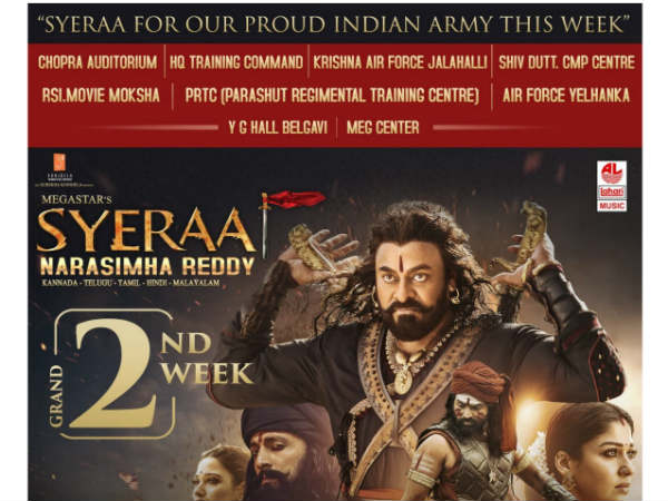 విడుదల తరువాత ఘనవిజయం సాధించిన ఈ సినిమాను ఇండియన్ ఆర్మీ కోసం ప్రత్యేకంగా ప్రదర్శిస్తూ సైరా ప్రత్యేకత చాటుకుంటున్నారు. కర్ణాటక డిస్ట్రిబ్యూటర్ ధీరజ్ ఎంటర్ప్రైజస్ వారు బెంగళూరులో ఇండియన్ ఆర్మీ కోసం ప్రత్యేకంగా 60 షోస్ ఏర్పాటు చేశారు. ఇందుకు సంబంధించిన వివరాలతో కూడిన పోస్టర్ ప్రస్తుతం నెట్టింట వైరల్ అవుతోంది. దేశం గర్వించదగిన సినిమాను దేశం గర్వించే విధంగా ప్లాన్ చేశారని అంటున్నారు ఈ విషయం తెలుసుకున్న నెటిజన్లు.