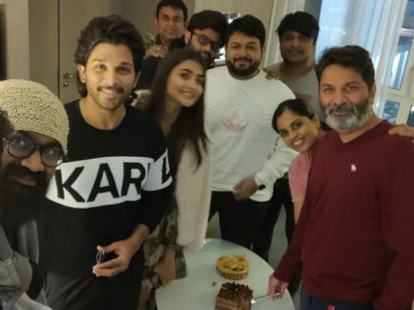 తమ దర్శకుడు త్రివిక్రమ్ శ్రీనివాస్ పుట్టిన రోజు సందర్బంగా ఆయనతో కేట్ కట్ చేయించి సంబరాలు చేసుకున్నారు 'అల.. వైకుంఠపురములో' యూనిట్ సభ్యులు. గత రాత్రి జరిగిన ఈ కార్యక్రమంలో హీరోహీరోయిన్లు అల్లు అర్జున్, పూజా హెగ్డే సహా మ్యూజిక్ డైరెక్టర్ థమన్, ఇతర టీమ్ అంతా కలిసి ఎంజాయ్ చేశారు.